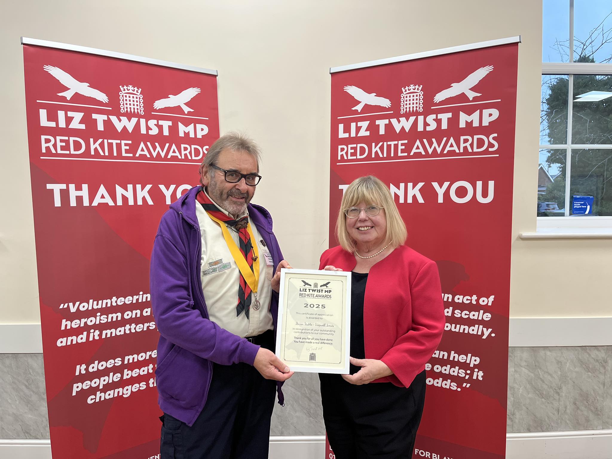 Posted on 18th November 2025 at 08:55.We are incredibly proud to share that our very own Lead Volunteer, Brian “Skip” Stubbs, has been honoured with a Red Kite Award by our local MP, Liz Twist. Skip…